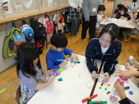 生徒がペットボトルにビーズを入れ、園児たちは色を塗ったり、折り紙で飾りつけをしたりと、思い思いのマラカスを完成させました。