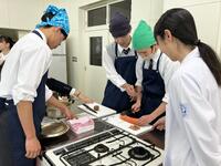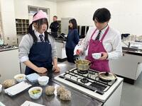 ライフデザインの授業で作ったタコミート(鹿肉)を活用し、おにぎりと汁物をつくる調理実習が行われました。