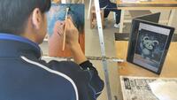 講師である画家の佐藤真康先生から、まずは油や絵の具やその他の道具の説明と扱いについての説明を受けます。と、その前に、講義を受ける池高生たちは、模写をすることになる絵やイラストを選んで下描きをしていました。